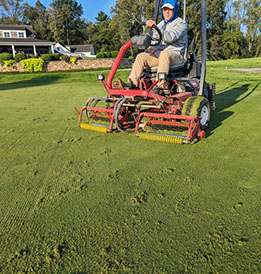 Fantastic summer conditions are achieved through spring practices: aeration, dragging turf to stand it up for a clean cut, topdressing, and proper fertilization